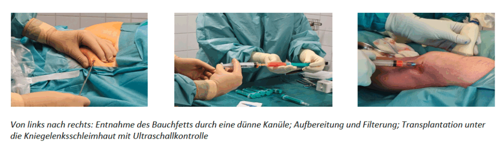 Mit Fettstammzellen besteht große Erfahrung im Bereich der Ästhetischen Chirurgie und sie sind leicht zu gewinnen. Wir haben unser Reservoir bei uns, typischer Weise am Bauch. Für Gelenke kann man keine Knochenstammzellen verwenden, weil sie zu Verknöcherungen führen. Fettstammzellen eignen sich hervorragend für die regenerative Medizin.