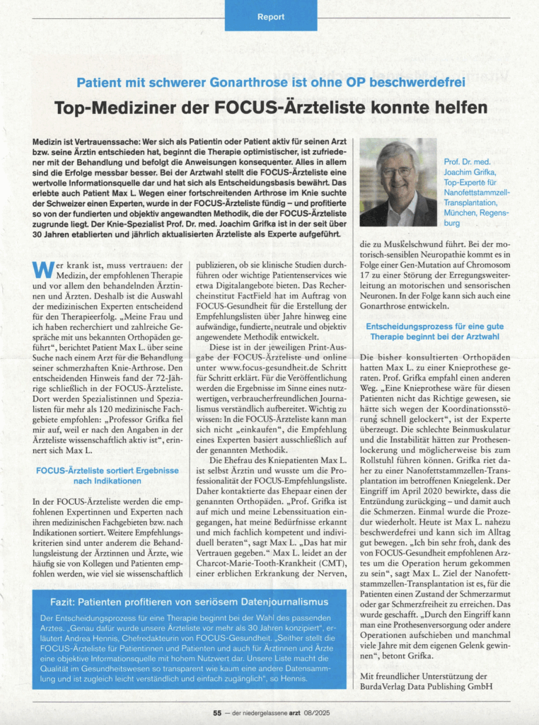 Bei Gonarthrose lohnt sich die Behandlung bei ausgewiesenen Expert:innen. Ein aktueller Pressebericht über Prof. Dr. med. Joachim Grifka zeigt, wie die gezielte Arztwahl den Therapieerfolg entscheidend verbessern kann.